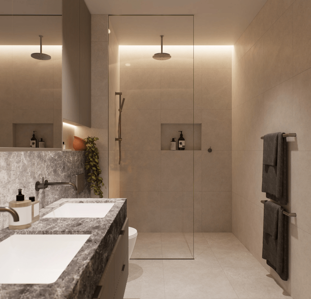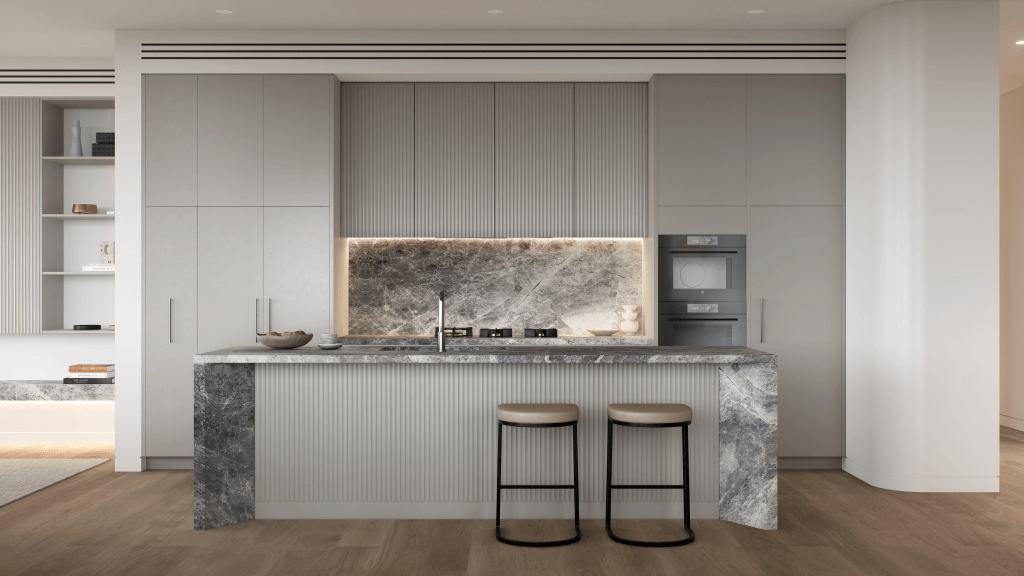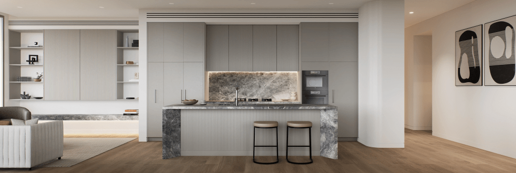 The attention to detail is second to none, with only the finest fittings and finishes, such as Astra Walker tapware and Swiss-made V-ZUG kitchen appliances. The apartments feature fresh whites, light greys, and honey accents, available in Salt or Smoke color schemes.