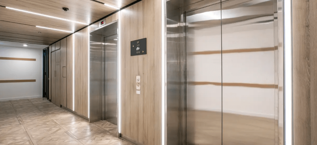 Spread across six levels, the building’s facade is characterised by contrasting dark and light elements. Sandwiched between rows of bold ochre materials is the building’s middle section, which showcases vertical crisp lines, white obelisks, and large glass panes.