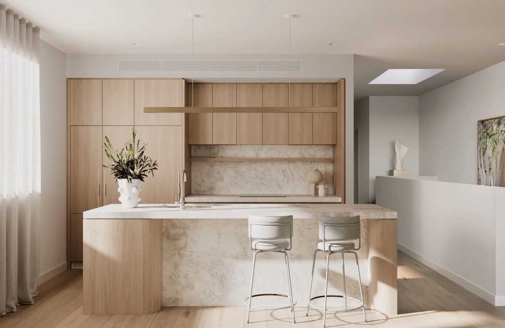 - Warm timbers, textural stone and natural light invites the outside in.