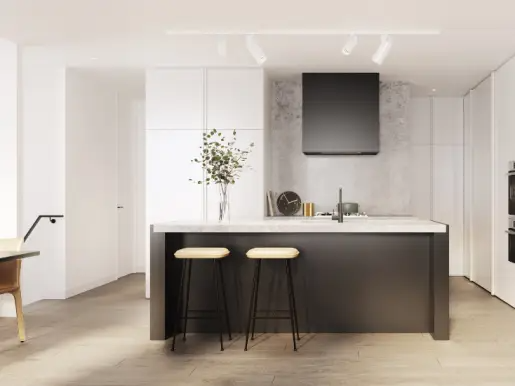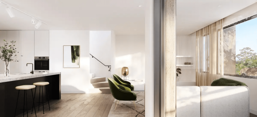 Featuring clean lines and a warm material palette, each residence comprises large open plan living spaces, private entertaining balconies and courtyards, designer kitchens, integrated European appliances, Natural stone finishes throughout, oak timber flooring, bedrooms with fully fitted robes, generous storage options, reverse cycle heating & cooling and other high quality appointments.