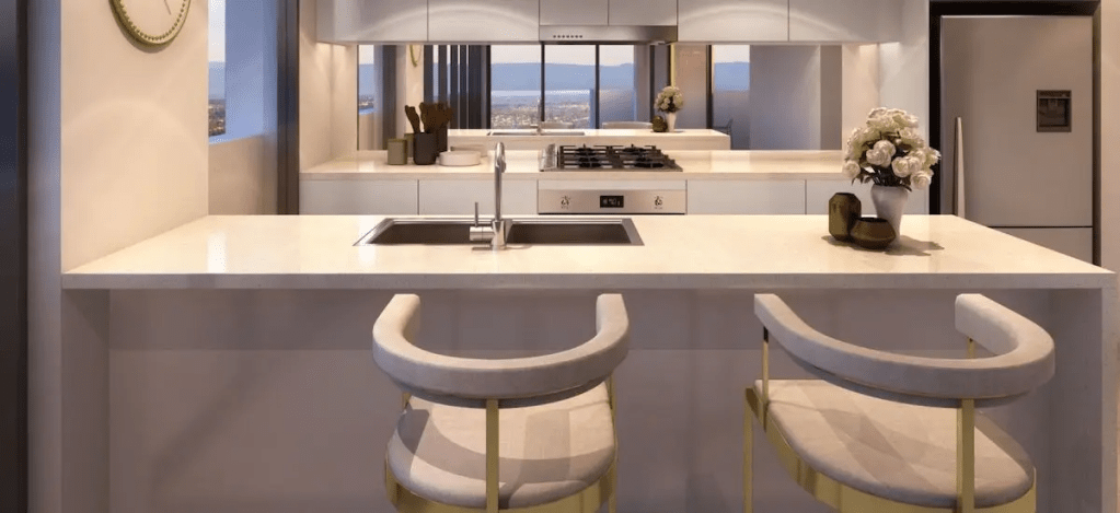 Kitchens are modern and intuitive in design with top of the range SMEG appliances, mirrored glass splashbacks and sleep Quantum Quartz bench tops. Bedrooms are sizeable, air conditioned and practical while bathrooms enjoy quality embellishments including polished chrome fixtures and frameless mirrors.