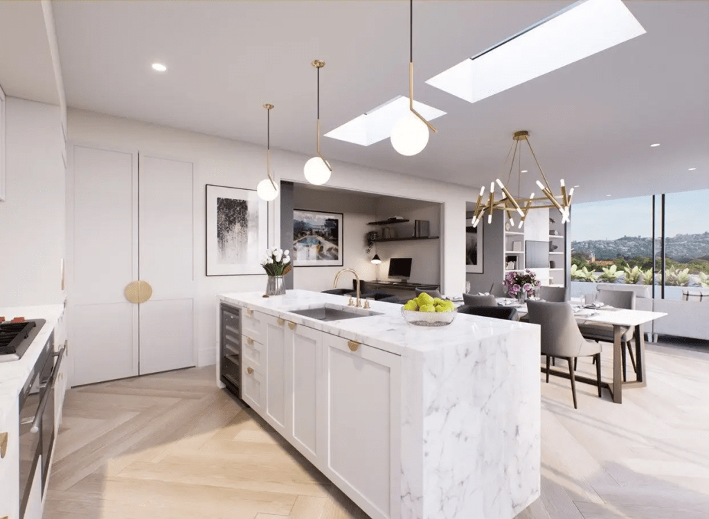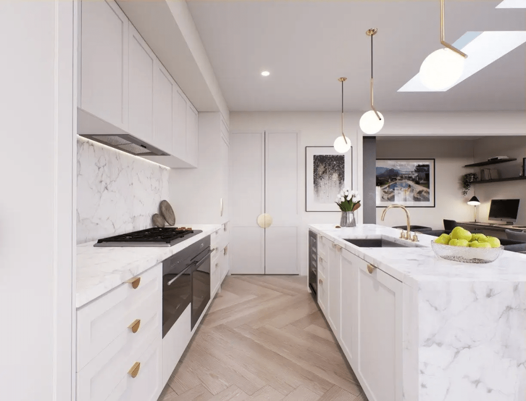 • Elegant finishes throughout as standard including European Oak herringbone flooring, Carrara Marble kitchen bench tops, plush wool carpet, motorised block out blinds and sheer designer curtains.
