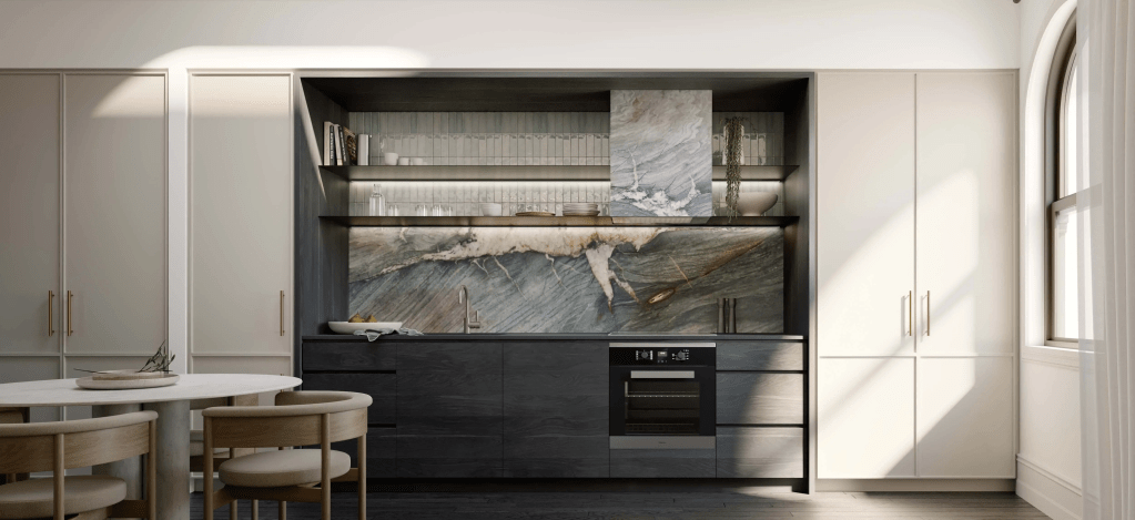 - Figured quartzite natural-stone benchtops and Herringbone timber flooring deliver practical beauty.