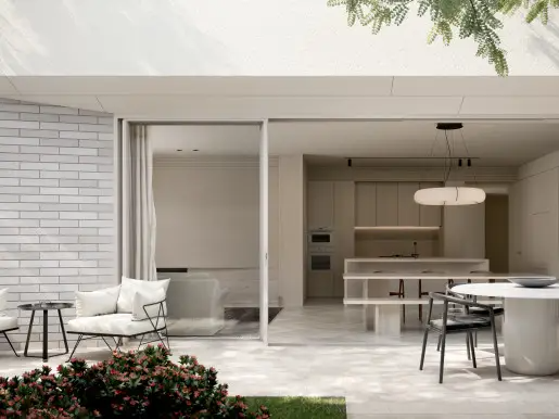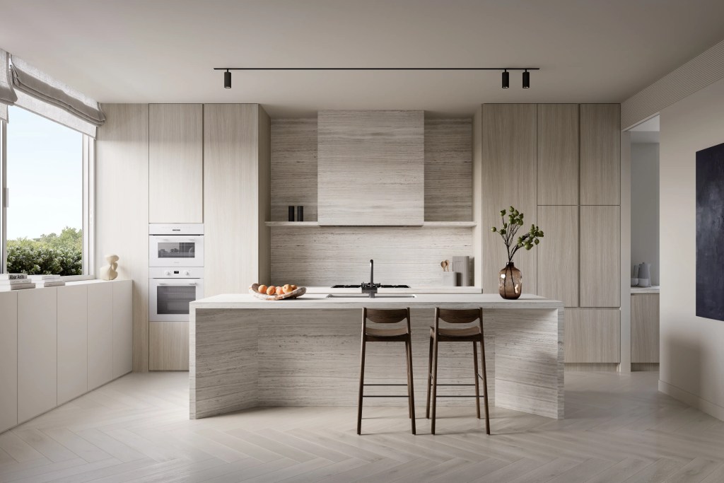 Conceived as a whole, the interiors and outdoor areas are unified by their refined material palette. The muted materiality of the floors, walls and joinery ensures spaces will always reflect the individual personalities of residents. Sophisticated fixtures, tactile finishes and bold gestures—such as the marble- top kitchen island and fireplace—create a strong sense of belonging.