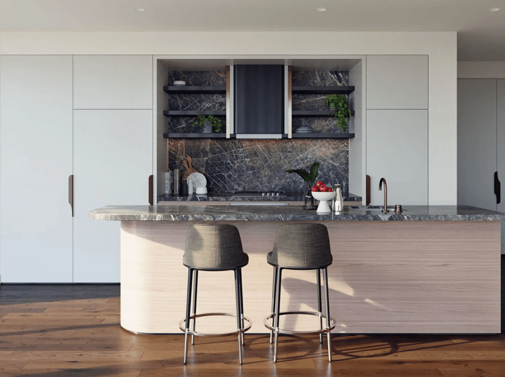 Design uses graceful curves to soften contemporary forms finished in lustrous metal, contrasting timber grain and honed marbled, to present richly appointed interiors with timeless appeal. Warmth and elegance permeates a material palette offered in a choice of light or dark tones across the European Oak floors, wool carpets, feature joinery and stone benchtops.