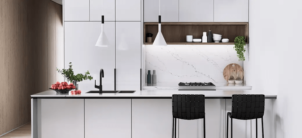 Upstairs, The Siding’s apartments are something else. There’s private balconies and floor-to-ceiling windows, which expand the open-plan living space and invite in natural light and fresh breezes. Stylish matte black fixtures in the bespoke kitchen and bathrooms set the trend for this new style of living.